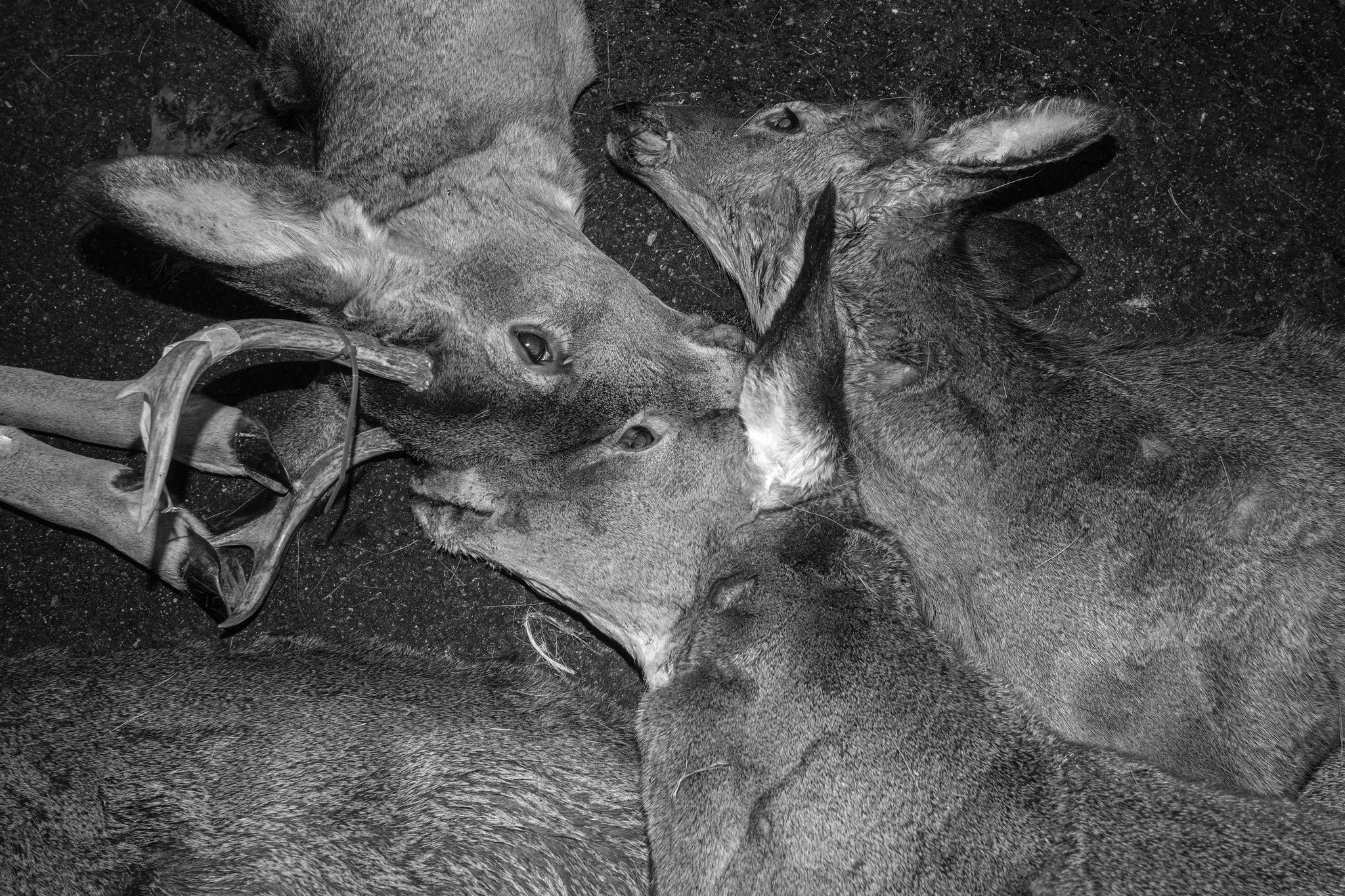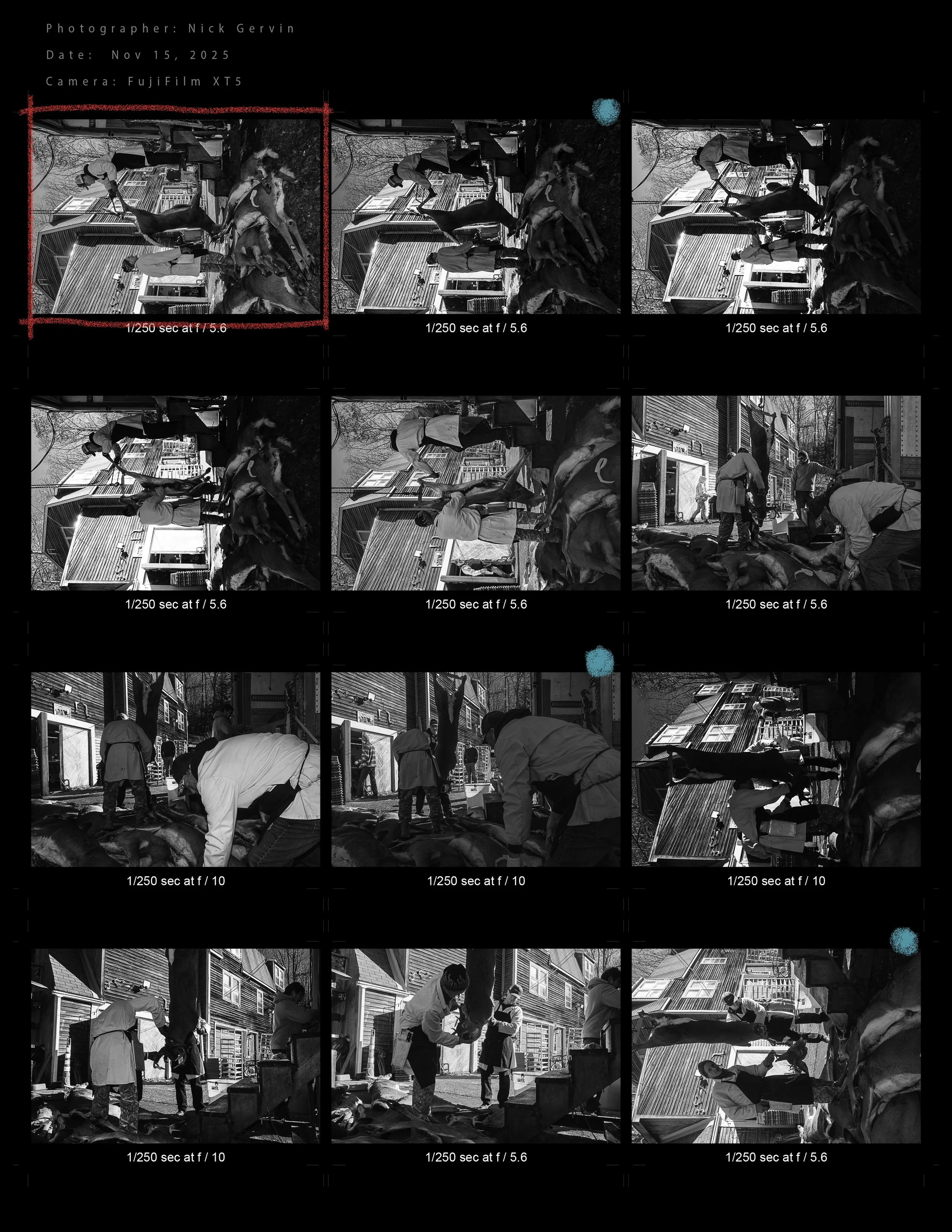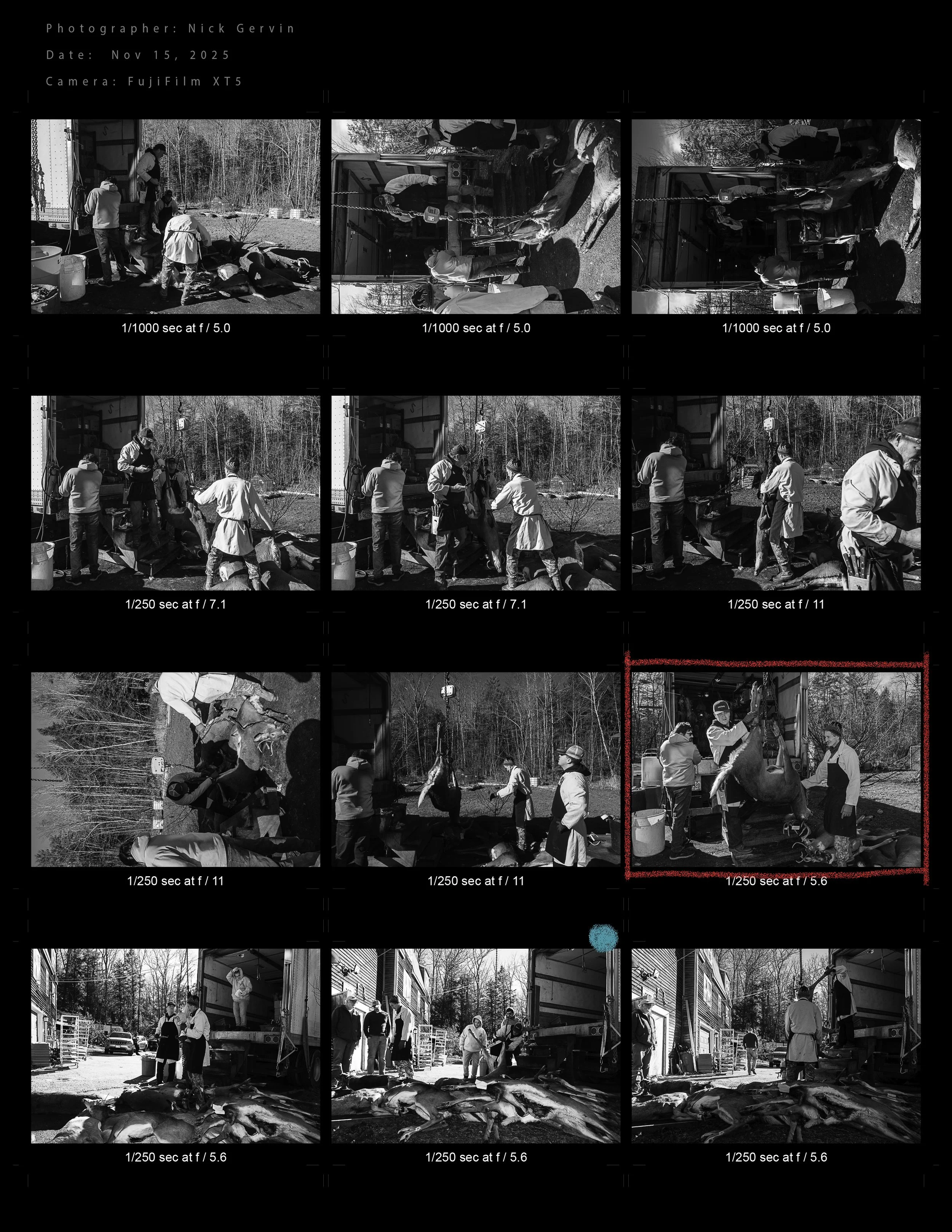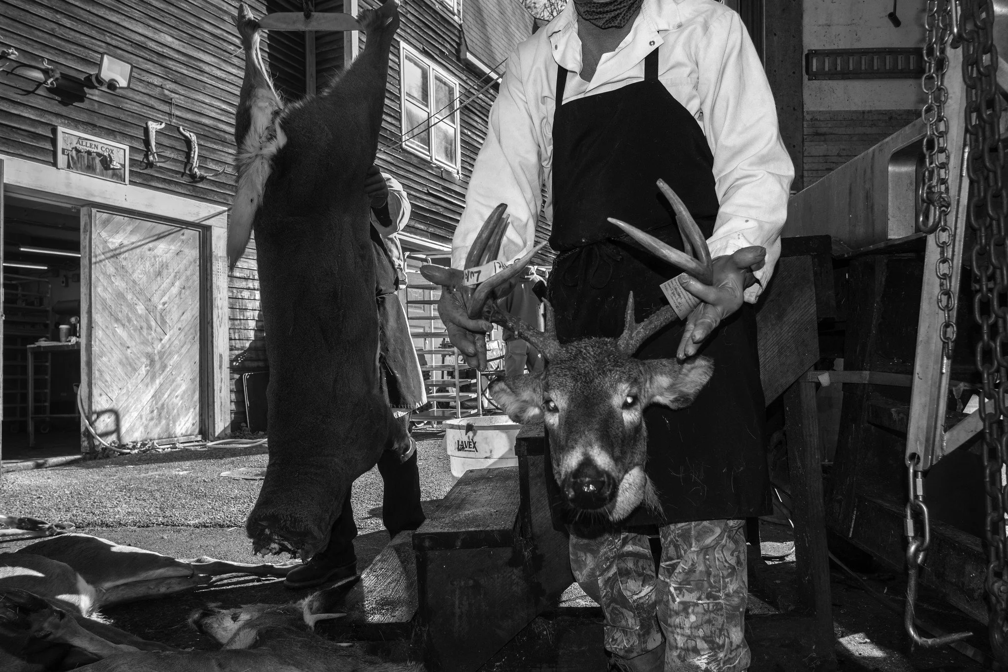 The owner was really busy and he looked stressed. He allowed me to stay and photograph as long as I didn’t impede his work. The scene itself was a nightmare. Deer carcasses piled up, heads being severed, bone heaps, and the ground was slick with blood. The experience climaxed when a man, while holding a deer’s head, glanced up and delivered a shocking one liner.