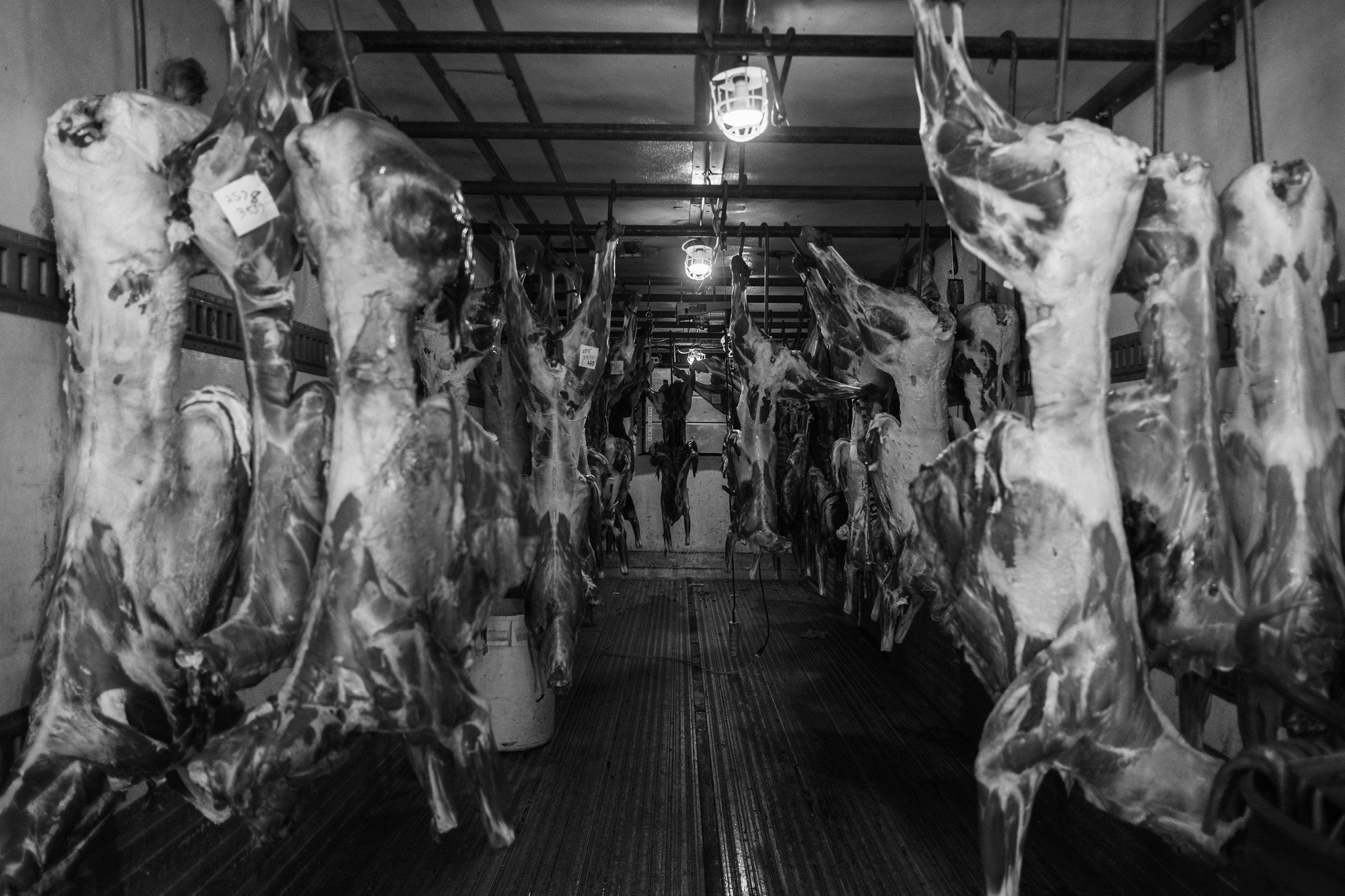 I remember pausing for a beat, standing there, checking my meter, trying to figure out how to photograph the scene. It’s quite dark in there, so I figured I’d cover my bases, cover a few shots with flash, and a few without. But in the back of my mind, I couldn’t help but think, man, this is really surreal. I know that this food is going to go to help feed hungry people, but still. These were wonderful, beautiful animals, alive sentient beings. And it’s just strange.